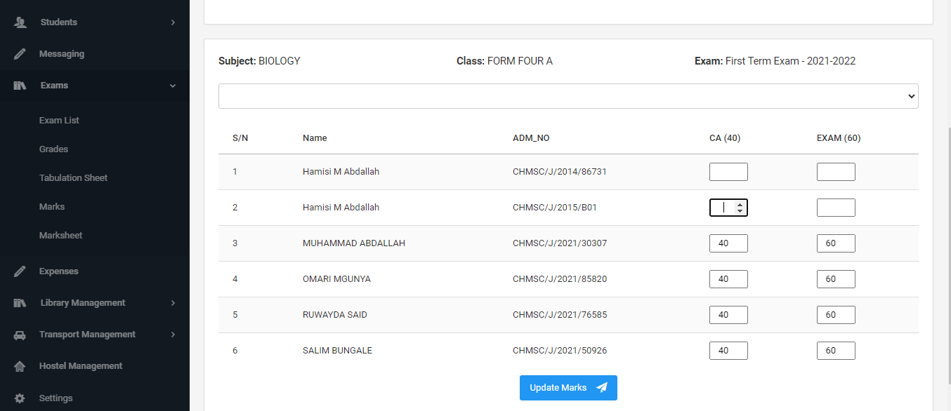 including exam listing, grades management, mark recording, result generation, mark sheets, and result printing, results, showing class student performance position.